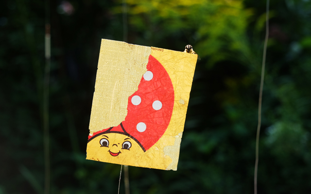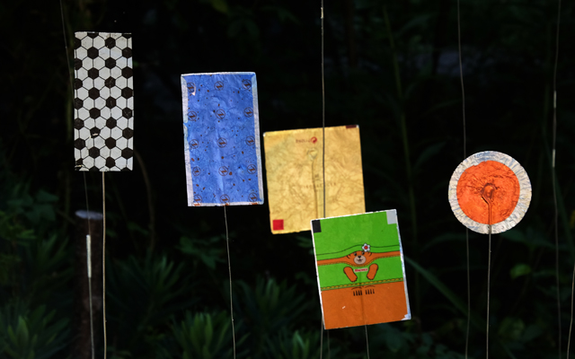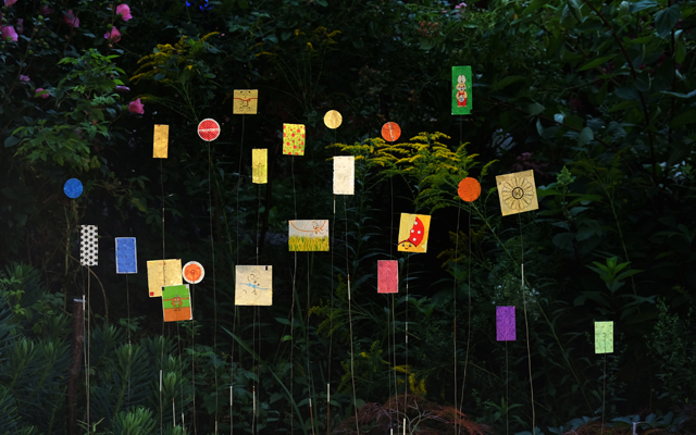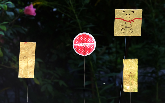2020 ist eine Serie für den Garten entstanden: Mit Silberfolien der verschiedensten Art, wackeln Hasen, Niederegger Marzipan oder Kaugummipapier frei im Wind, auf Federstahl.